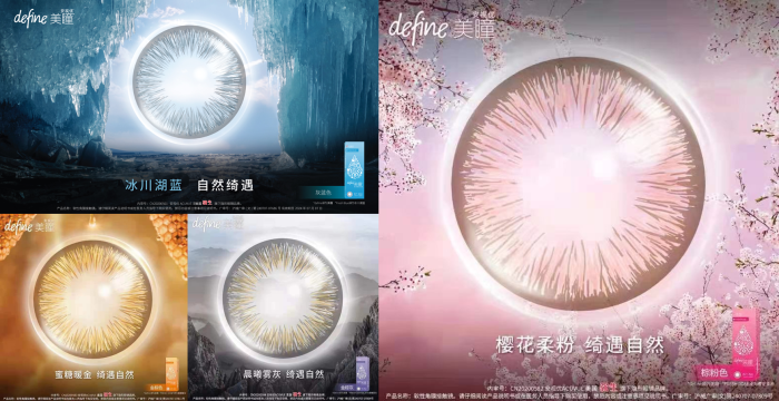 源于自然,美于自然。相比主打知性精致人群的美瞳®经典系列,自然绮遇系列在花纹和色彩设计上更显年轻时尚,展现独特的个性之美。樱花柔粉留驻漫树樱花层叠粉意,仿佛高甜软萌的人间芭比;蜜糖暖金取自剔透蜂蜜的阳光暖金,再现活力率真的元气少女;冰川湖蓝源于冰川湖泊的清透水蓝,宛如混血气质的甜酷女孩;晨曦雾灰则捕捉黎明破晓的灰金光影,如同邂逅酷飒灵动的鬼马精灵。