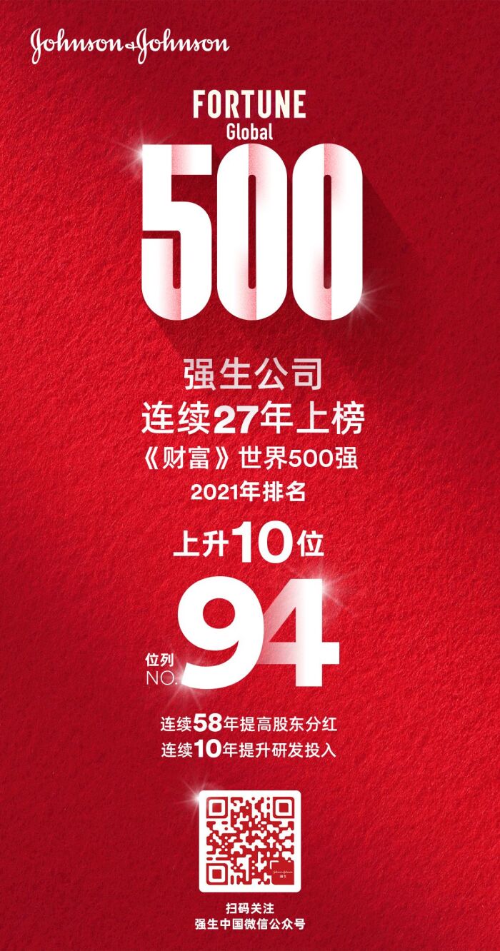 在最新揭晓的2021年《财富》世界500强排行榜中,强生荣登第94位,较去年上升10位。